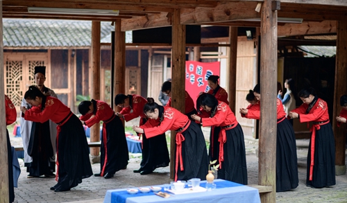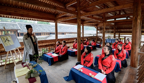 課堂正式開始前進(jìn)行了一場(chǎng)隆重的“開學(xué)儀式”。 據(jù)《禮記》記載:“禮義之始,在于正容體,齊顏色,順辭令。”因此,第一課即是“正衣冠”。同學(xué)們換上漢服,一一站立,由先生依次檢查,然后“衣冠整齊”地排著隊(duì)集合。之后按照先生的要求,將手放到水盆中“凈手”,寓意凈手靜心,去雜存精,希望能在日后的學(xué)習(xí)中專心致志、心無旁騖。步入學(xué)堂后,舉行拜師禮,同學(xué)們向至圣先師孔子三叩首、進(jìn)獻(xiàn)“釋菜禮”,寓意尊師重道、勤奮好學(xué)。
