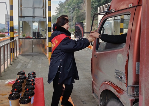 活動當天,雖然氣溫較低,但是在臨海南收費所入口處,身著紅色綬的志愿者們依然熱情地為過往司乘人員遞一杯杯滾燙的姜茶,并過往大貨駕駛員發放優惠政策宣傳單。