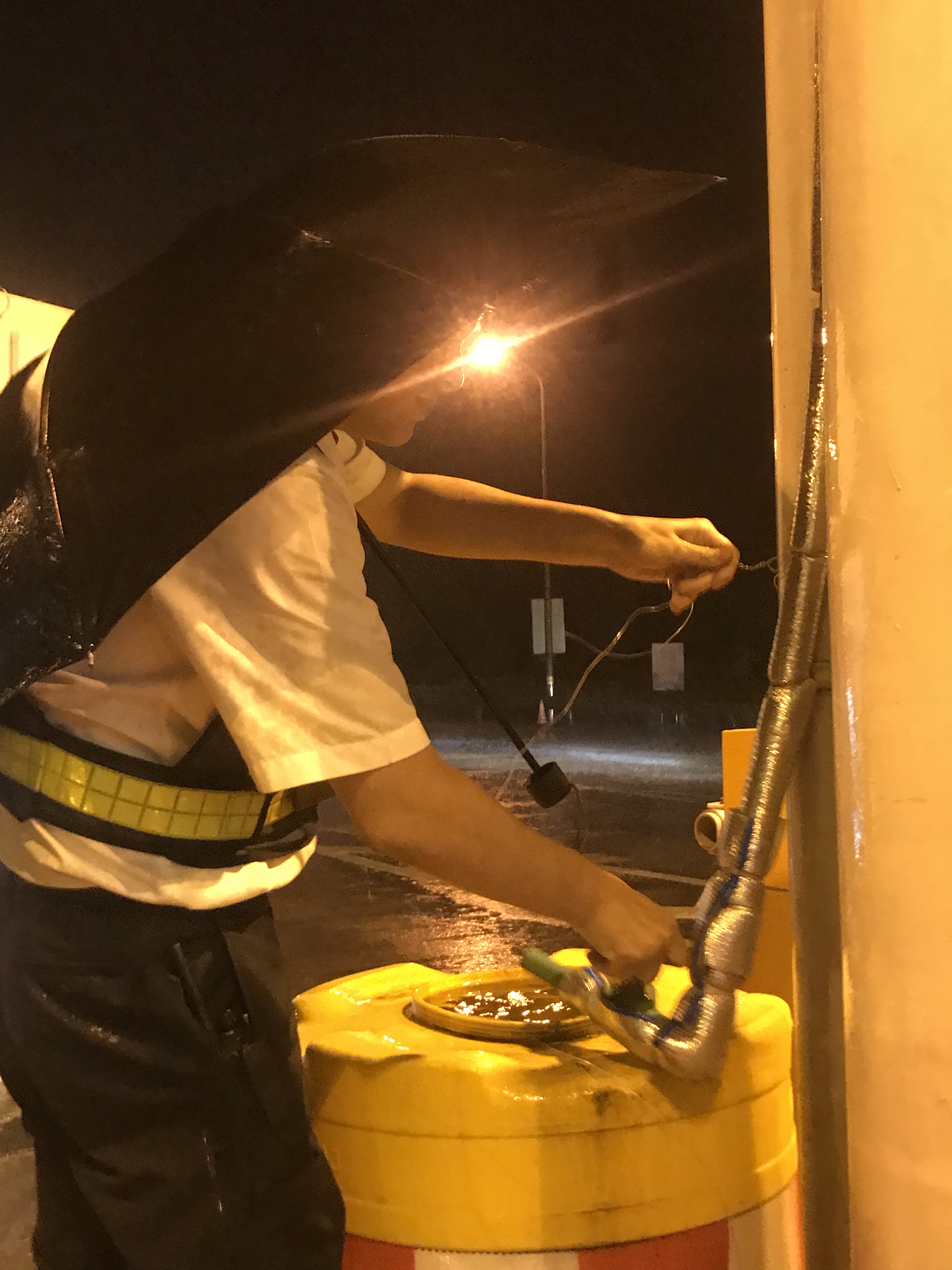 8月10日凌晨1點(diǎn)05分,為了安全起見,集團(tuán)副總經(jīng)理章海峰帶領(lǐng)所長(zhǎng)助理周戰(zhàn)、辦公室毛宇航、安保部陳科、機(jī)電維養(yǎng)中心何小敏等人捆扎崗?fù)け伙L(fēng)吹散的收費(fèi)設(shè)施。所務(wù)駕駛員徐海順駕駛皮卡車將崗?fù)と藛T分批撤離。收費(fèi)班長(zhǎng)成守村在人員全部安全撤離后還未離開,直到重新檢查發(fā)現(xiàn)無異后才冒雨返回辦公樓。