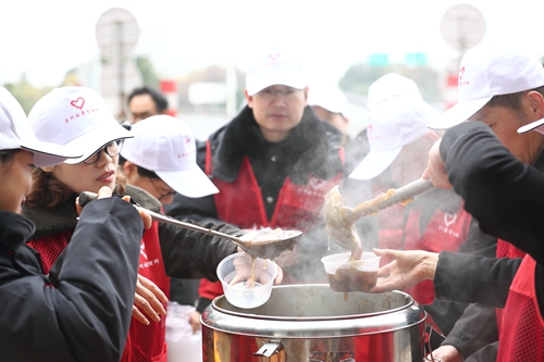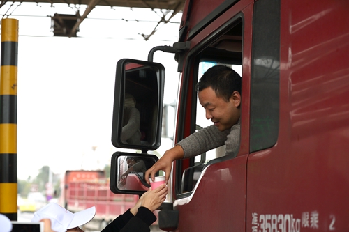 圖為志愿者合影 “師傅,喝一杯紅糖姜茶暖和一下吧。” “師傅,您這是貨車,這里有一份貨車非現(xiàn)金支付優(yōu)惠的單子,請了解一下。”