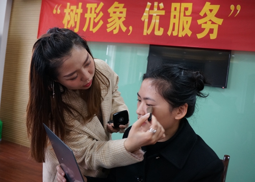 圖為員工練習化妝 通過培訓,大家掌握了妝容的基礎知識和化妝的基本技巧,這不僅有助于提升自我形象和精神面貌,而且帶妝上崗能夠靚化窗口形象。 楊雅芬