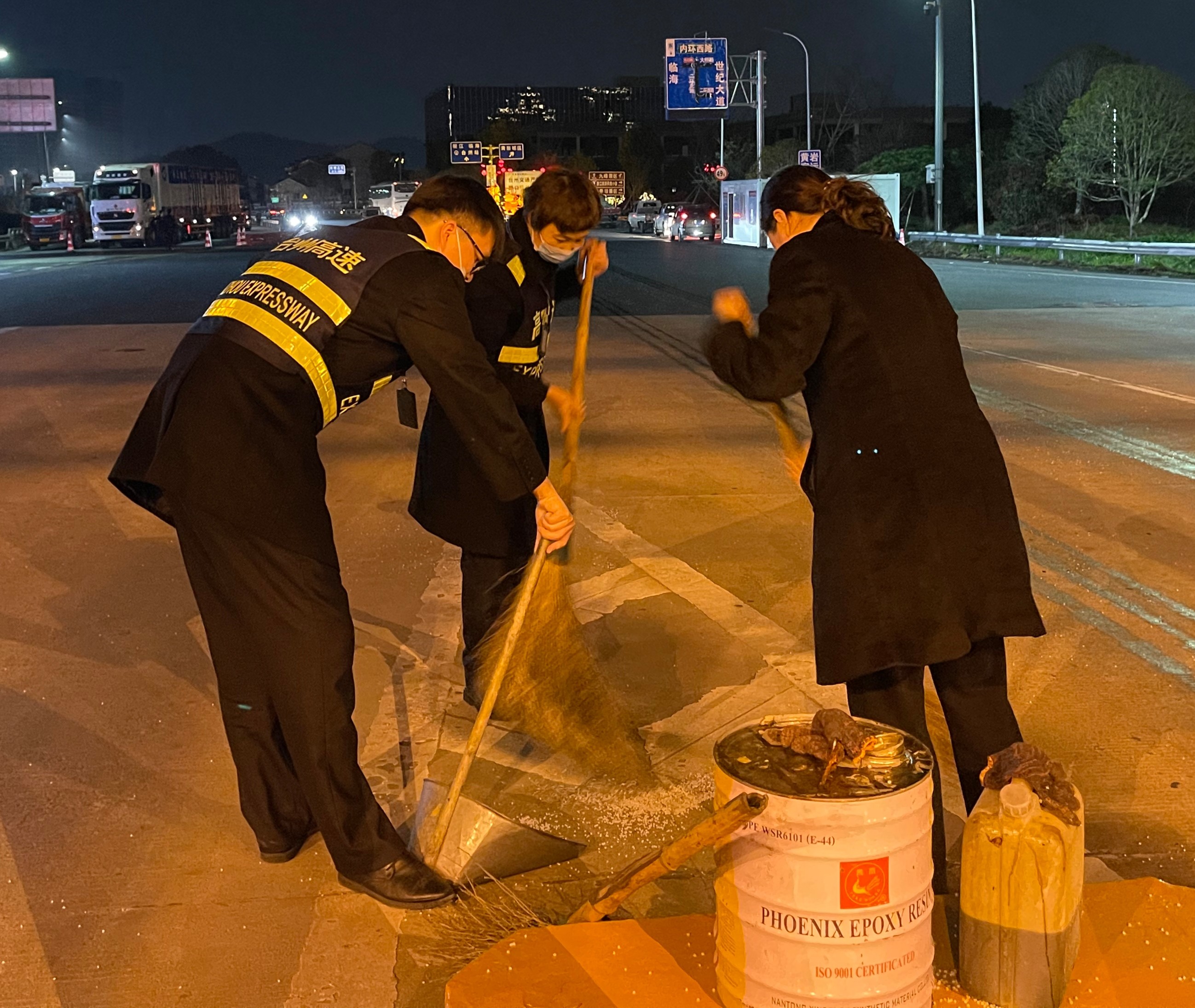 (圖為工作人員在清掃) 一時(shí)之間,車道路面上落滿大量的塑料顆粒,考慮到夜色已深,ETC車道上行駛的車輛速度大多很快,萬(wàn)一司機(jī)沒(méi)有及時(shí)發(fā)現(xiàn)前方道路上的灑落物,極易造成輪胎打滑,嚴(yán)重影響行車安全。情況緊急,為了后續(xù)通行車輛的安全,收費(fèi)班長(zhǎng)立刻關(guān)閉了該ETC車道,并放置警示標(biāo)志,然后將這一情況上報(bào)給監(jiān)控中心和收費(fèi)所值班人員。不等清潔人員到來(lái),收費(fèi)員羅時(shí)杰從車道的工具房拿出掃帚和簸箕,主動(dòng)開始清掃工作。隨后其他不坐崗的收費(fèi)員也投入到了清掃工作中,這支臨時(shí)清掃小隊(duì)在沒(méi)有任何人的領(lǐng)導(dǎo)下自發(fā)地組織起來(lái)。這時(shí),從高速上完成機(jī)電養(yǎng)護(hù)工作的機(jī)電班工作人員正巧路過(guò),他們看到這一幕立刻將車停靠在一邊,加入清掃隊(duì)伍。盡管散落的塑料顆粒數(shù)量較多,但在大家的共同努力下,車道終于被清理干凈,恢復(fù)了正常通車。 春日的夜晚微風(fēng)拂過(guò),已有春的暖意,而更暖的是這一幕在春夜里的一個(gè)個(gè)身影。大家因?yàn)橐患∈露墼谝黄穑欢踩珶o(wú)小事。所有人心系安全,為所有過(guò)往車輛保暢保安全,為臺(tái)州高速貢獻(xiàn)自己的一份力。 崔翔浩 吳侃霓