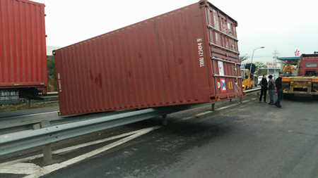 12月15日10:10分左右,一輛車牌為浙B88C06的集裝箱車在臺州南副站選擇出口車道時,因變道和出口運(yùn)載汽車的長掛車發(fā)生碰撞,使得未鎖牢的集裝箱箱體甩落下來,砸到護(hù)欄及進(jìn)口一輛正在通行的貨車車頭,造成護(hù)欄變形、貨車車頭受損嚴(yán)重,所幸無人員受傷。