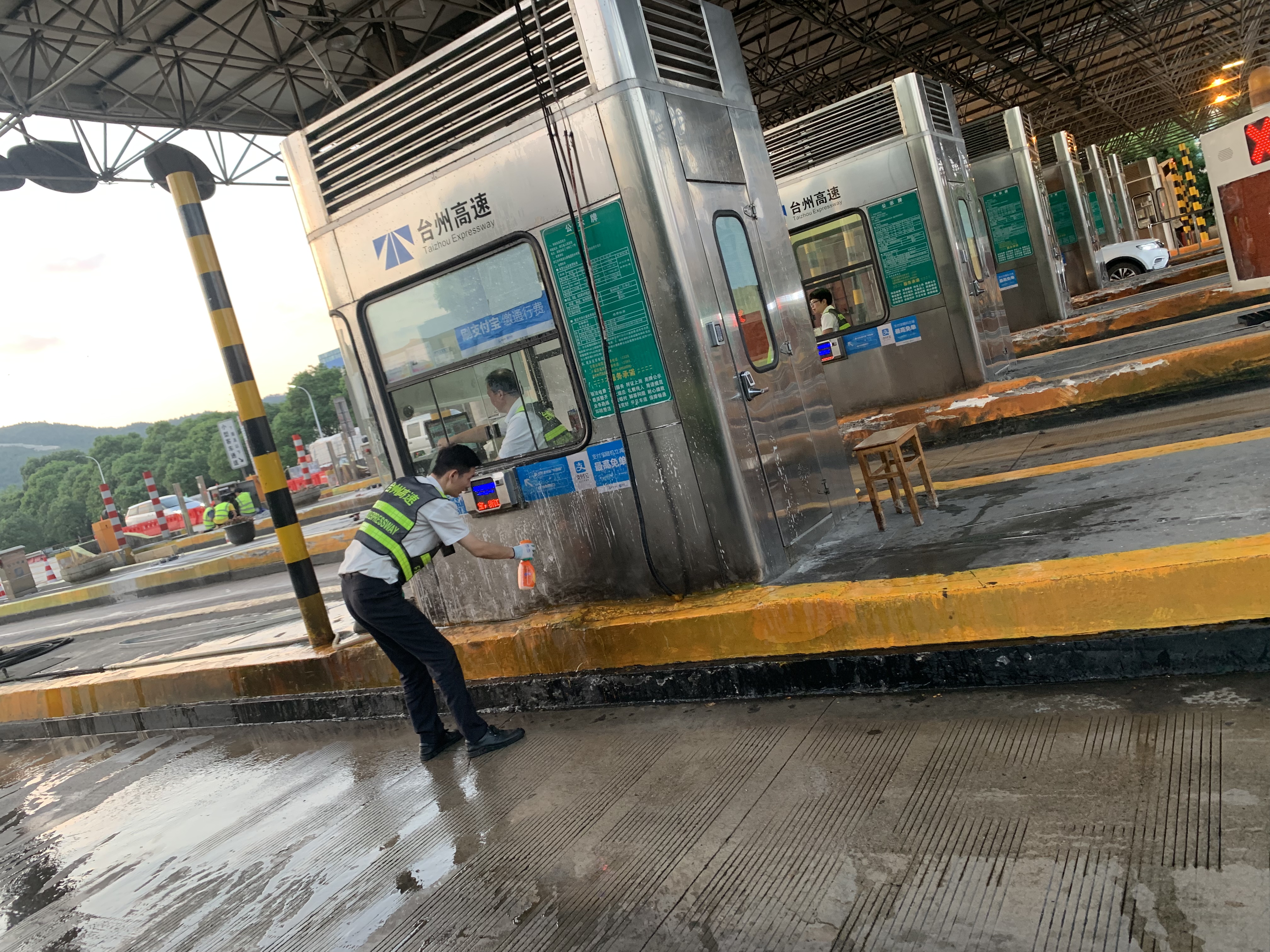 圖為工作人員打掃車道衛生 此次環境衛生大掃除本著徹底清理、不留死角的原則,以班組為單位,細分責任區,明確保潔要求,限時清理,全所員工充分發揚不怕苦、不怕累的精神,重點對收費站內外廣場、車道、崗亭、島頭、邊溝、標志標牌等區域及設施設備進行了一次深度清潔。