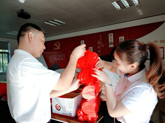 圖為工作人員一起布置收費所 在慶祝祖國70周年生日的日子里,最火的顏色就是紅色。為了弘揚中華民族傳統文化,溫嶺西收費所后勤組早早購置了燈籠、彩旗、五星紅旗,寫好“慶祝祖國70周年華誕”大字等。黨員帶頭,團員緊跟,一線收費員紛紛參與,在收費站大門口、辦公樓、食堂、宿舍等區域精心用五星紅旗、大紅燈籠、五顏六色的彩旗裝點,一抹抹艷麗的國旗紅,成為站點最靚麗的風景。明亮的黃、鮮艷的紅,美麗窗口突然亮了起來,到處洋溢著濃濃的國慶氛圍,為過往司乘提供暢、潔、美的節日行車環境。 溫嶺西收費所后勤組還精心策劃、精細編排,制作了具有特色、獨具創意的生日祝福“小視頻”,祝祖國生日快樂! 通過開展弘揚愛國精神,喜迎國慶活動,溫嶺西收費所全所工作人員更加不忘初心,砥礪前行,共同慶祝祖國70周年華誕。 鄭霞霞