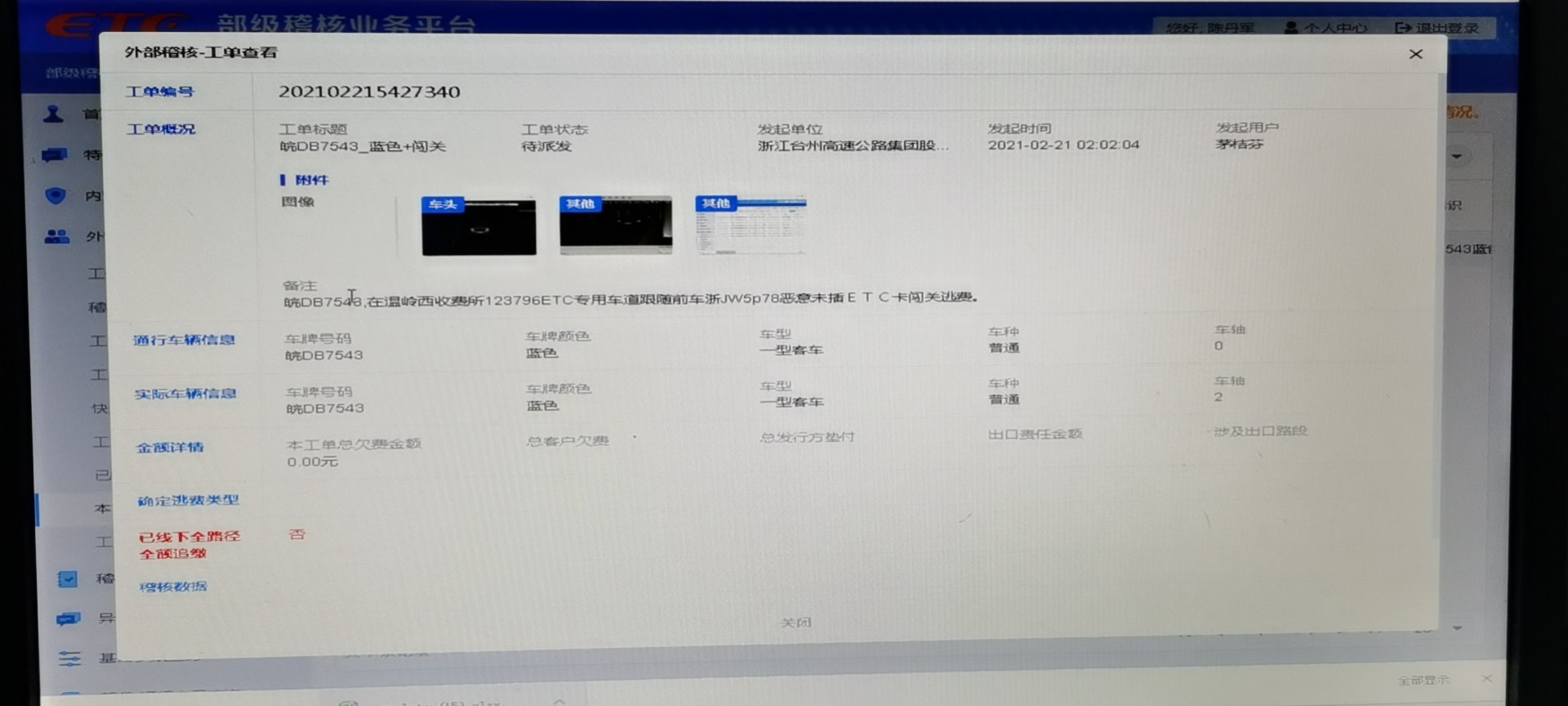 2月20日,溫嶺西收費所發生一起一輛小型客車在ETC車道緊跟前一輛車出站,借此偷逃通行費,被工作人員發現后立即上報監控,發起工單,追繳該車通行費。