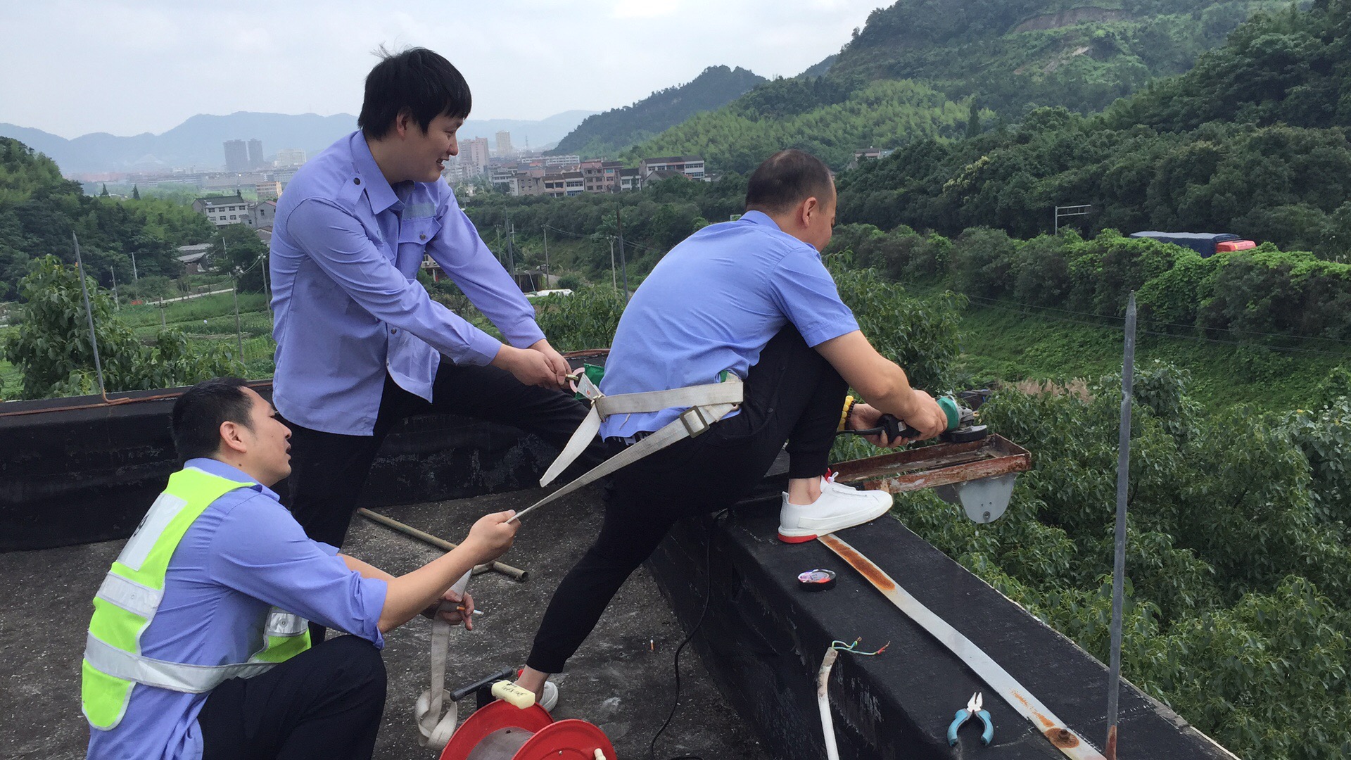 堅持優良傳統,執勤隊員變廢為寶 6月24日上午,乘著難得的晴天,大溪嶺隧道所執勤隊對管理房的標牌射燈進行更換。 由于射燈需設置在屋頂,隊員們需要爬到四樓屋頂。一到房頂,隊員們傻眼了,原來的高壓鈉燈經過風吹日曬地早已銹跡斑駁,燈具無法拆卸。面對困難,黨員干部要沖在前,現在唯一的辦法是用切割機切割,因為高空作業的危險性,執勤隊長站了出來,腰上綁著安全帶,站在屋頂邊緣作業。拉著安全繩的隊員們都為隊長捏了一把汗,幸好,同事們配合默契,幾個小時后順利完成LED射燈更換工作,新換上的LED節能燈,不僅使命壽命長,而且又節能環保。
