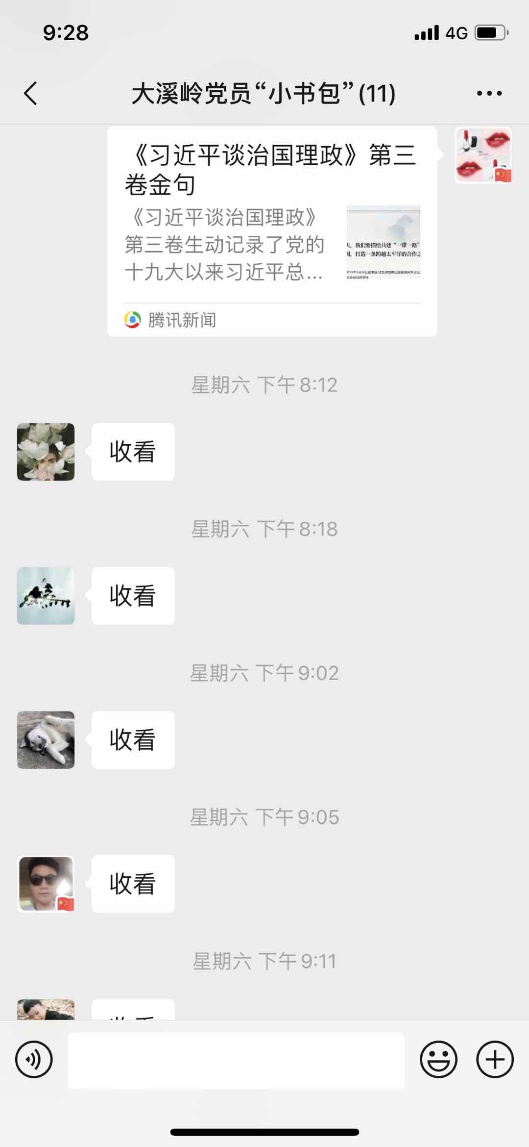 黨員“小書包”的建立,進一步拓展和暢通了聯系黨員的信息渠道,可以24小時在線聯系黨員、征求意見,能在線進行實時回復和互動,同時可以通過微信群及時發布上級文件精神、習近平總書記重要講話內容、學習教育心得、會議通知等等,進一步提高學習教育效能。 黨員“小書包”的建立,讓黨員們的學習內容不受書本限制,學習教育不受地域、場所的限制,在繁忙的工作學習之余,大家可以在微信群中了解當前時下最新的學習內容、信息和動態,相互學習,交流體會,無形提升自己的政治素養。 黨員“小書包”的建立,實現了黨組織和黨員之間“親密”、“即時”、“微距”的接觸,加強了黨員同黨組織之間的信息互動。通過“小書包”的建設,大溪嶺學習教育時刻保持鮮活的生命活力和時代氣息,形成了“輕松自主學習、實時互動交流”的良好學習氛圍,提供了更好的動力。