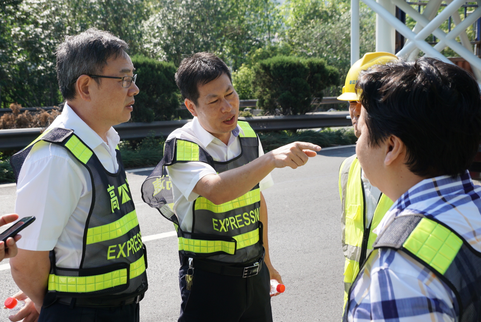 圖為吊裝現場 在甬臺溫高速公路臺州段溫州方向主線K1668+200M處現場,陳文波詳細了解龍門架吊裝的施工工序、取消省界收費站總體施工進展情況、項目時間節點、人員班組安排及安全措施準備情況等。