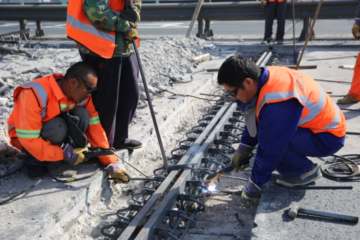 隨后,在伸縮縫型鋼安裝現場,陳文波撿起鑿除的碎渣,查看被鑿除的舊伸縮縫情況。公司所轄路段屬于軟土路基,且有91座橋梁,由于運行時間已20余年,部分橋梁伸縮縫破損較為嚴重,如何維修橋梁伸縮縫和橋頭跳一直是個老大難問題。在橋梁伸縮縫修補現場,因為重車的碾壓,部分伸縮縫已經磨損嚴重,所在的混凝土路面只能借助鑿巖機進行作業。