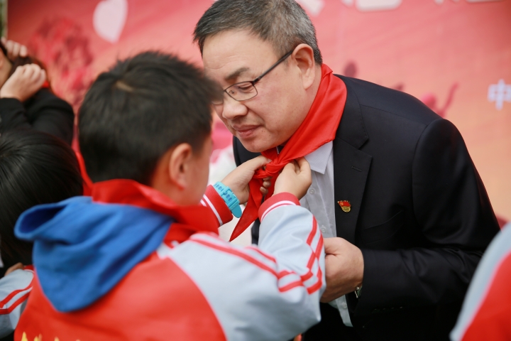 在“點亮微心愿”環節,臺州高速集團領導班子們為學生代表送上新衣服、學習用品等,孩子們則為志愿者叔叔阿姨們系上了在他們眼中最珍貴的紅領巾。