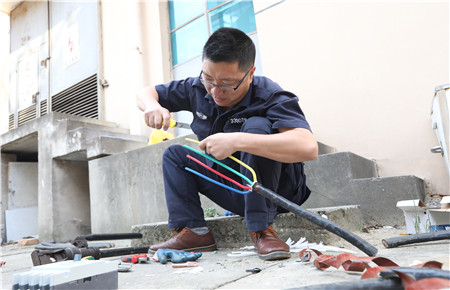 臺州收費所倉庫前方的空電工操作的選手們一字排開,他們熟練地用電工刀,在電纜上輕輕一劃一轉,整個絕緣外殼立馬脫離,緊接著去鉛皮、掰角度、壓接頭,不到10分鐘,一根三相四線電纜接頭就此制作完成了。