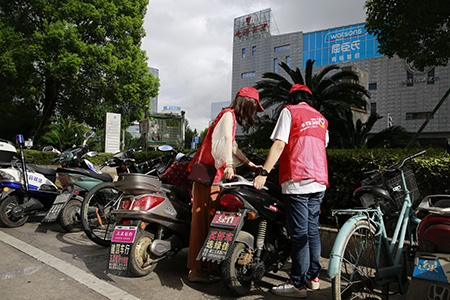 圖為志愿者將不規(guī)范停放的電瓶車挪到規(guī)范位置