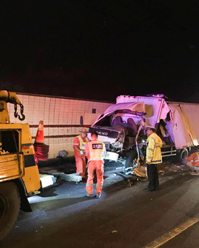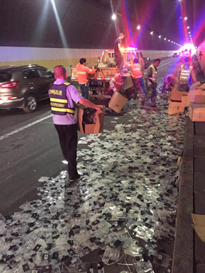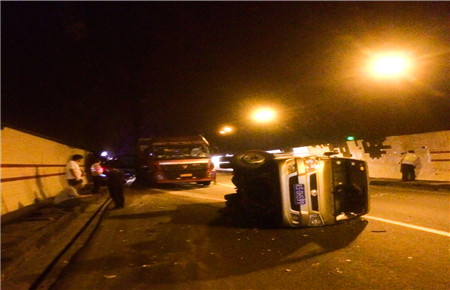 這輛“始作俑者”的車輛由于司機(jī)疲勞駕駛,不慎撞擊隧道壁而引發(fā)側(cè)翻,雖然該車內(nèi)無(wú)人員受傷,可是跟隨其后的拖掛車就沒(méi)那么幸運(yùn)。拖掛車司機(jī)看到前方出狀況,當(dāng)即采取緊急制動(dòng),剎得太急又致使后方小貨車追尾,導(dǎo)致該車車頭嚴(yán)重受損,司機(jī)的手臂受了傷,運(yùn)輸?shù)匿X塊也撒了一地。