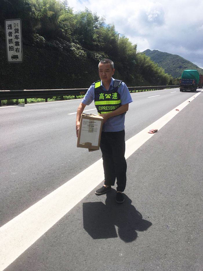 圖為執(zhí)勤隊員搬走掉落在高速車道上的快件 “可是如何歸還快件呢?快遞小哥再來取,還是寄回?” 執(zhí)勤隊員與物流公司負責(zé)人商量著。由于隧道所地處特殊位置,讓快遞小哥來隧道所領(lǐng)取肯定不方便,大家便提出將快件帶回臨海,再聯(lián)系順豐公司直接將快件寄給收件人。然而因紙箱掉落地面受過摩擦,使得快遞單破損且上面字跡變得模糊,一時無法確定相應(yīng)收貨人聯(lián)系方式。 “沒有上面的信息,物流公司怎么在堆積如山的快件中查詢到這份快件的信息呢?”執(zhí)勤隊員有點犯難了,他們告知物流公司物件重量,掉落地段,掉落的大致時間,并描述快件的外觀等依稀模糊的可辨特征,一次次不厭其煩的與物流公司溝通,終于根據(jù)模糊不清的外包裝相關(guān)信息確認了收件人的聯(lián)系方式。 物流公司在收到寄出快件的運單號時向執(zhí)勤隊員連聲道謝:“這快件里面是汽車配件,很多是不容易配齊的專有型號,多虧了執(zhí)勤隊拾得并歸還包裹,要不然丟失客戶單子賠錢挨訓(xùn)是小,影響公司名譽就麻煩了。”隊長叮囑對方下次運送快遞時一定要放好物品,并注意安全。 毛譯聆