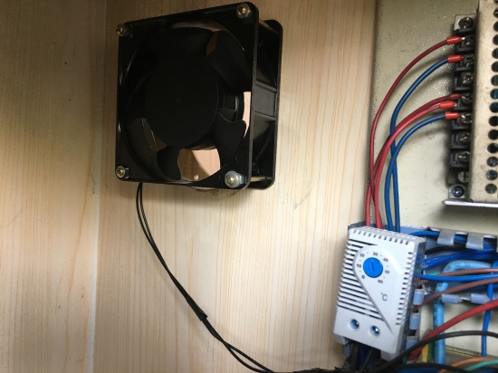 圖為安裝好的溫控風扇 “在機拒內側即與崗亭連接地方,開個孔安裝一個3.5寸左右自動溫控風扇,是否就可以把機柜內產生的熱量及時排出?” “可行,不過我認為左右側各取一個孔比較好,這樣還可以讓崗亭內空調冷氣流經機柜,形成交換,降溫效果會更好。” “整個運轉過程不需要人為干預,我們討論一下,如何安裝和設置風扇的溫控參數,實現機柜的智能化降溫。” 維養中心的技術員們在如何給機柜降溫事項上熱烈地討論著。 有著“制作小能手”稱號的電工何小敏根據大家討論的方案,決定先在臺州收費所1號崗亭試點。他從店里購置了相應尺寸的開孔器,帶領班組2名成員,在嘈雜的車流聲中完成了溫控風扇定位、開孔、安裝及取電等一系列工序,最后將溫控參數設置在攝氏25度,一旦機柜內的溫度達到這個數值,風扇就會自動開啟,并與崗亭內的冷氣形成交換,及時排除內部熱量。 小創新,大作用。經過多天的實測,裝有自控風扇的機柜內部溫度要遠低于其他未裝的機柜,而且還處于一個相對恒溫狀態。下一步,維養中心將在公司全線收費站崗亭推廣加裝此類風扇,確保設備的安全穩定運轉。 項寅曉