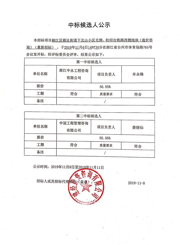 椒江區(qū)葭沚街道下北山小區(qū)北側(cè)、杭紹臺鐵路西側(cè)地塊(造價(jià)咨詢)中標(biāo)候選人公示
