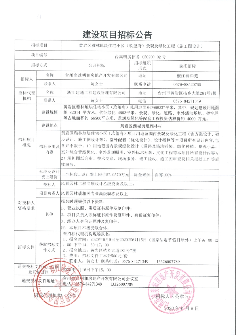 黃巖區雅林地塊住宅小區(玖璽府)景觀及綠化工程(施工圖設計)招標公告