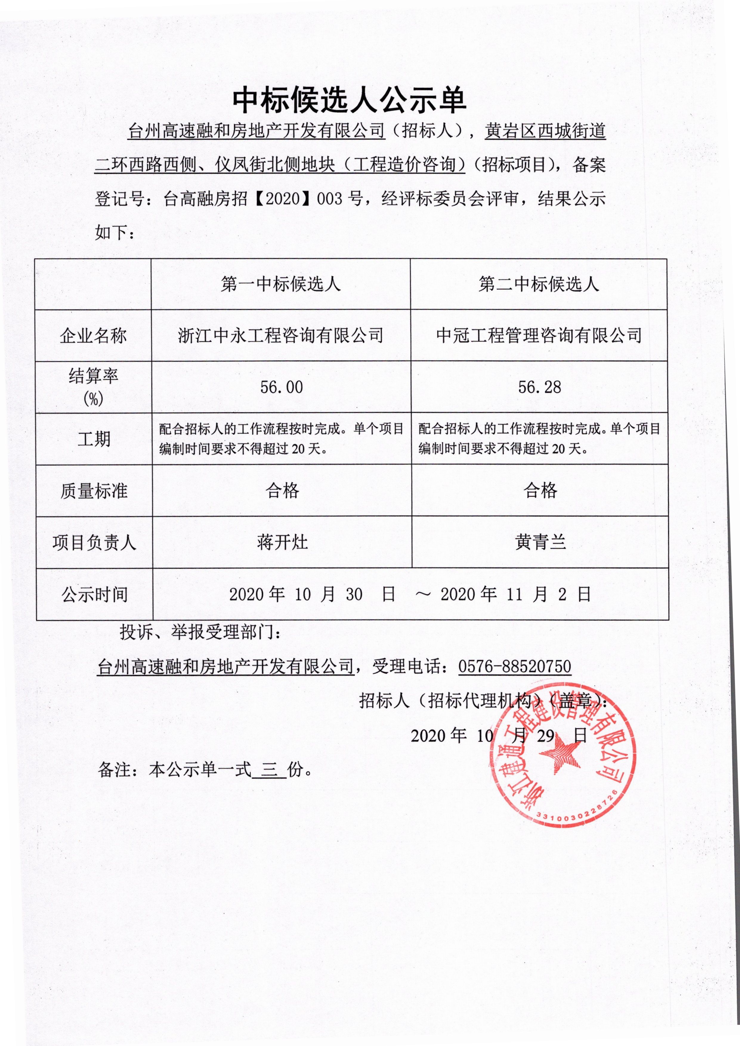 黃巖區(qū)西城街道二環(huán)西路西側(cè)、儀鳳街北側(cè)地塊(工程造價咨詢)中標(biāo)候選人公示單