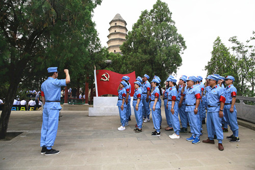 圖為黨員在梁家河合影 不顧前一天的舟車勞頓,第二天一大早,黨員們整裝出發(fā),在紅色旗幟引領(lǐng)下,頂著烈日,一路步行到達寶塔山山頂。“手抓黃土我不放,緊緊兒貼在心窩上。幾回回夢里回延安,雙手摟定寶塔山。”綜合支部的小周對著寶塔山,情不自禁地大聲誦讀起賀敬之的《回延安》。黨員們在巍巍寶塔下高舉右拳,用鏗鏘有力的聲音宣讀了入黨誓詞,對于大家來說,重溫入黨誓詞是共產(chǎn)黨員表達自己為共產(chǎn)主義奮斗終生的最佳方式,黨員們的心靈再次受到震撼和洗禮。
